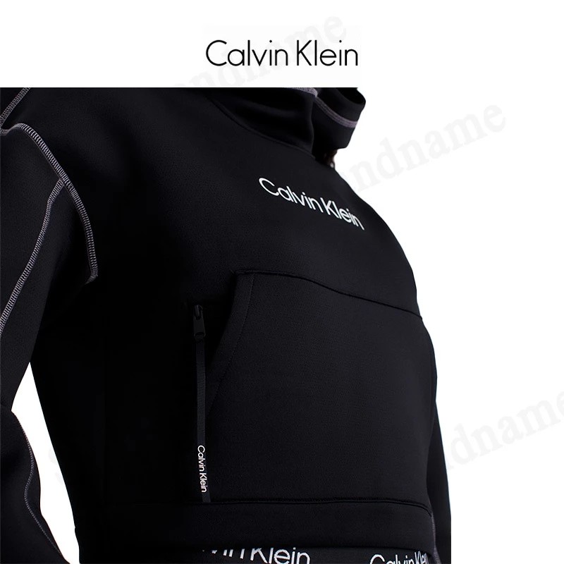 – หน้าอกแต่งชื่อแบรนด์ Calvin Klein สีขาวแบบนูน อันเป็นสัญลักษณ์ของแบรนด์
