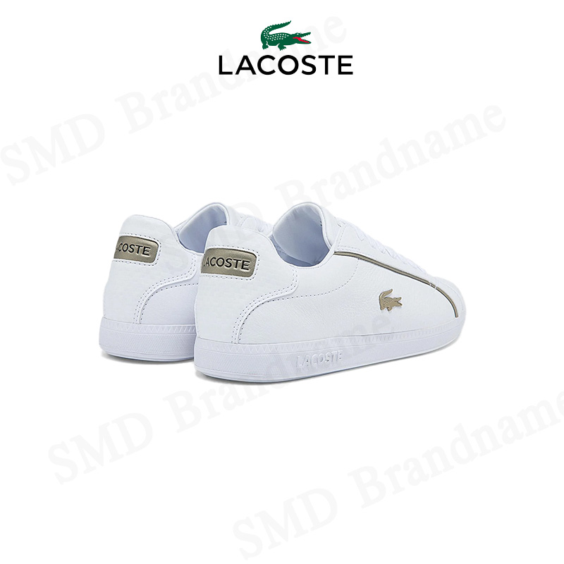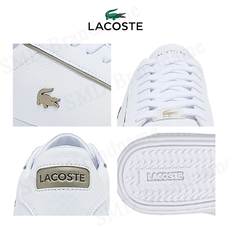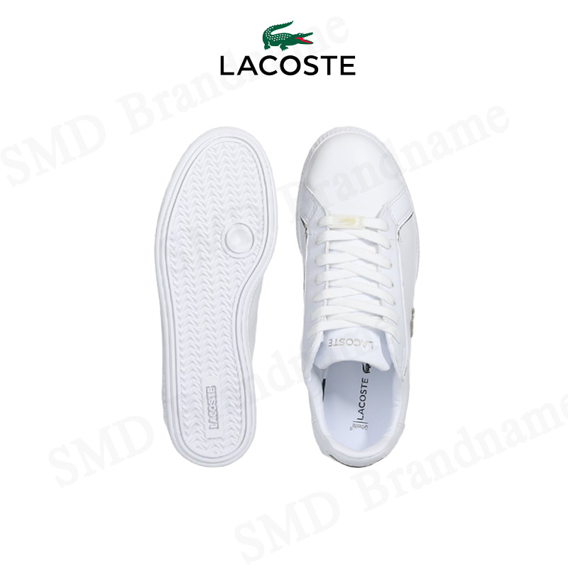 – ด้านข้างรองเท้าสีขาวแต่งลายเส้น และโลโก้จระเข้สีเงิน อันเป็นสัญลักษณ์ของแบรนด์ Lacoste