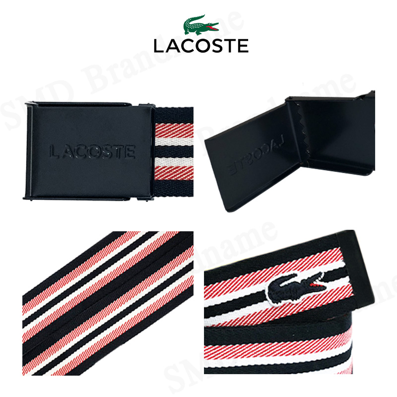 – หัวเข็มขัดเป็นแผ่นเหล็กเคลือบแกะสลักชื่อแบรนด์ Lacoste อะไหล่สีดำ