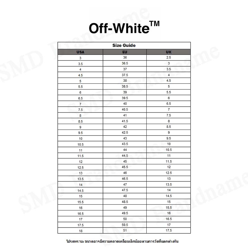 – ด้านหน้าบนรองเท้าตกแต่งคำว่า OFF-WHITE อันเป็นสัญลักษณ์ของแบรนด์