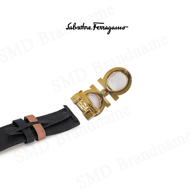 – หัวเข็มขัดทรง Gancini เป็นเอกลักษณ์ ตรงกลางสลักชื่อแบรนด์ Ferragamo อะไหล่ทอง